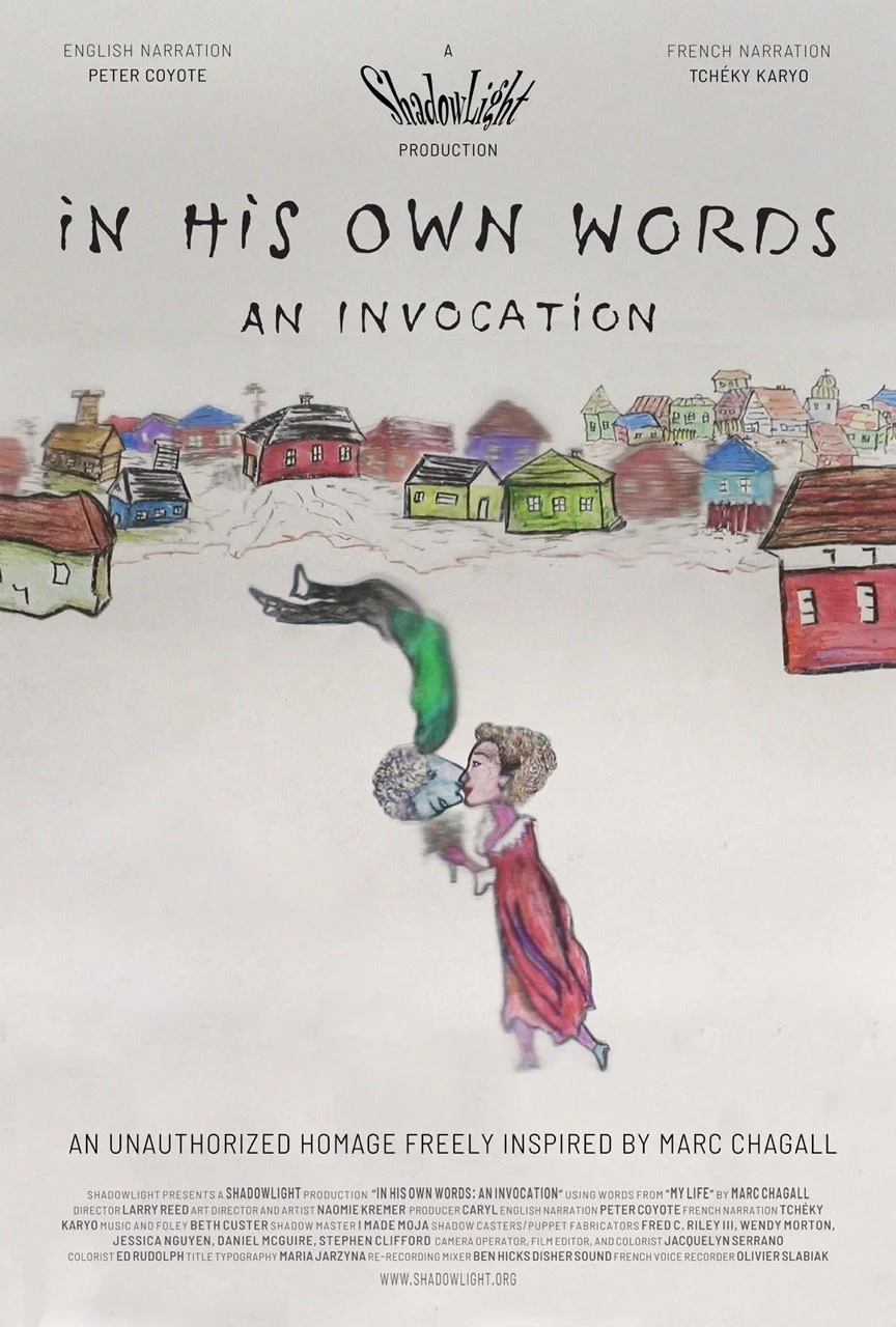 Blending shadow puppetry, animation, and early cinematic techniques, the production transforms Chagall’s words and paintings into a living tapestry of light and movement. Directed by Larry Reed with art direction by Naomie Kremer, this ShadowLight Productions film employs hand-crafted puppets, layered projections, and painterly visual effects evocative of Chagall’s dreamlike imagery.