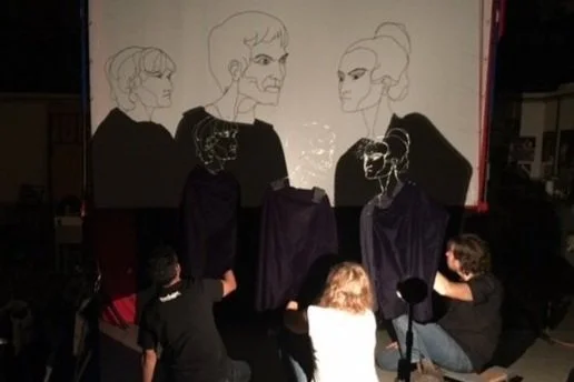 Backstage shot of I Made Moja, Caryl Kientz, and Fred C. Riley III puppeteering the wire puppets.