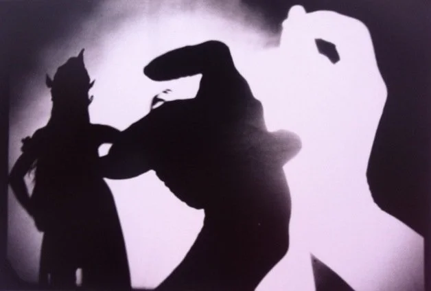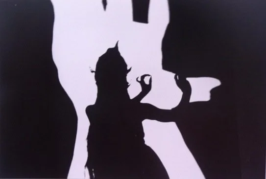 I worked with two Javanese dancers and photographed their hands in all kinds of dance postures. These were then projected onto cardboard and plastic and cut out to form various positive and negative images about one meter wide and half a meter high. We used three halogen lights to project these images onto a giant screen. The dancers then moved within a forest of their own hands, dancing around and through them. They told a story which seemed to be a strange take on Fatal Attraction: A refined young woman meets a dangerous man. They flirt. He gets too forward with her. They fight—he with a club, she with a bow and arrow. She kills him.