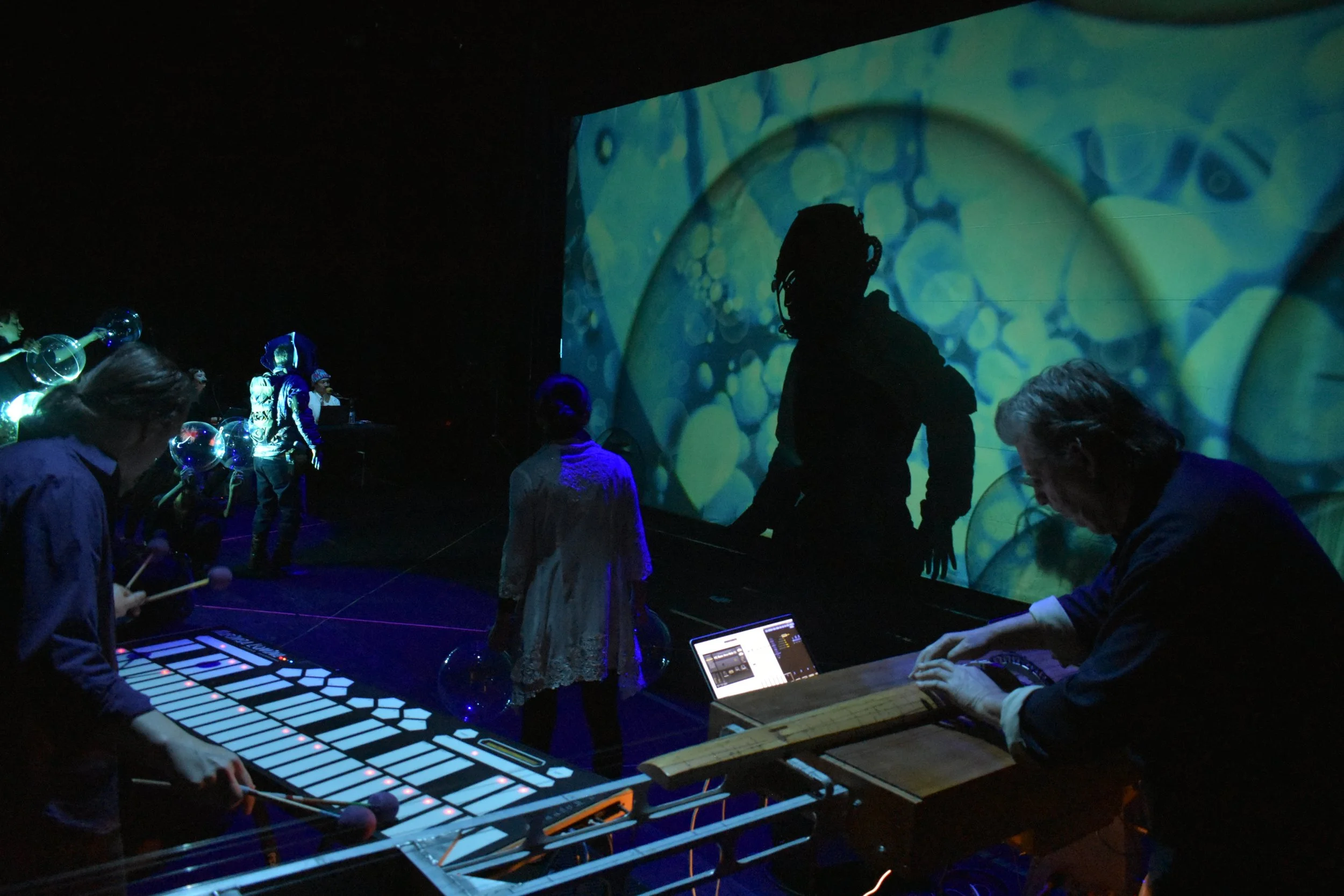 The music was be performed live by the electro-acoustic duo featuring composer Dresher performing on the Hurdy Grande and Quadrachord (created and constructed in collaboration with Daniel Schmidt) and acclaimed percussionist Joel Davel performing on Don Buchla’s invented mallet instrument, the Marimba Lumina.