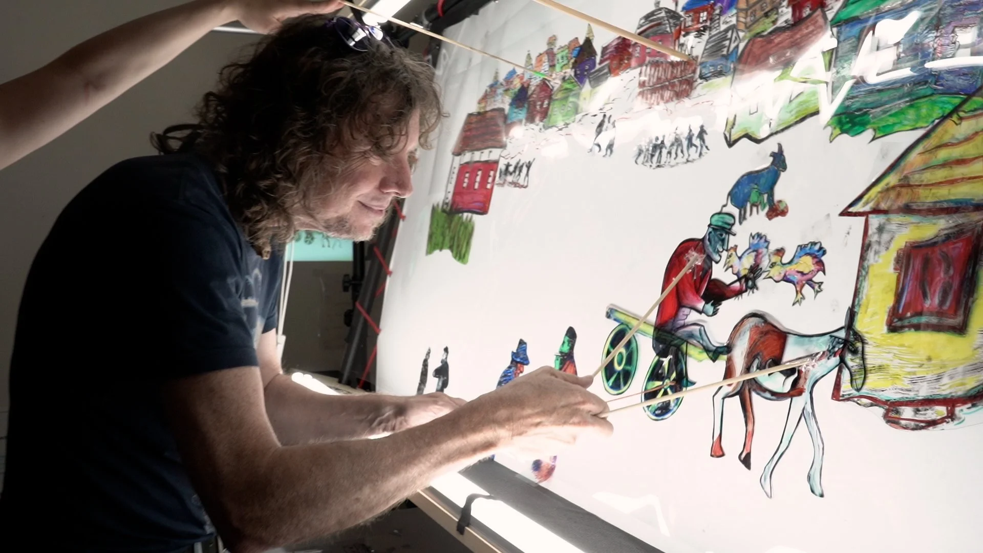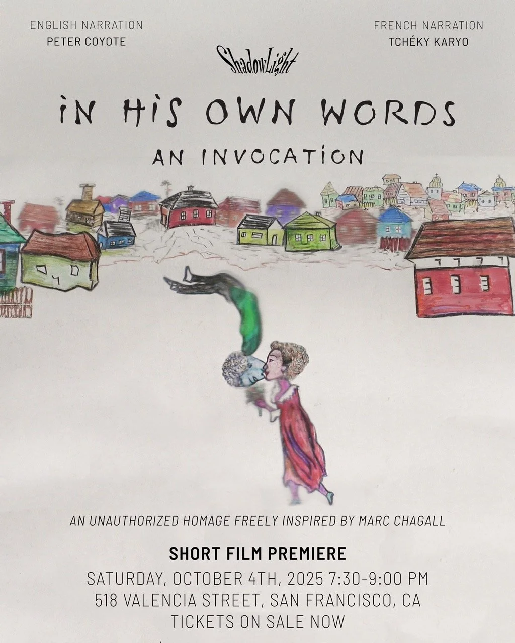 Blending shadow puppetry, animation, and early cinematic techniques, the production transforms Chagall’s words and paintings into a living tapestry of light and movement. Directed by Larry Reed with art direction by Naomie Kremer, this ShadowLight Productions film employs hand-crafted puppets, layered projections, and painterly visual effects evocative of Chagall’s dreamlike imagery.